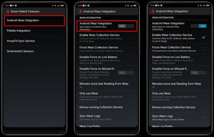 - Habilite a integração com o Android Wear (Ligado - ON) e selecione "Habilitar o serviço de coleta" (Enable Wear Collection Service). Em seguida, aguarde um momento e verá os dados em seu relógio