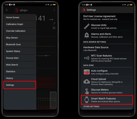 - Use xDrip+ para configurar seu relógio em seu telefone. Abra o xDrip+ e clique no botão esquerdo superior, em seguida, clique em "Configurações" (Settings) na barra de navegação